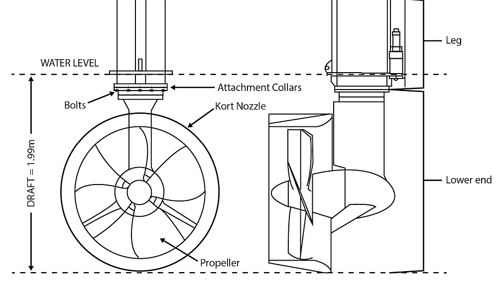 Each Z-drive thruster unit is made up of a horizontal shaft, a vertical leg, and a lower end. The lower end of the vessel’s Z-drive thruster unit includes the propeller, kort nozzle, and an attachment collar. It is secured to the leg’s attachment collar by 14 bolts (Figure 4). When the Z-drive thruster unit on the Deer Island end of the vessel made contact with the bottom, these securing bolts were sheared off when the lower end detached from the leg. The attachment collar on the leg was also pushed up and deformed. When the Z-drive thruster unit on the Letete end of the vessel made contact with the bottom, those securing bolts were also sheared off when the lower end detached from the leg. The lower ends of both Z-drive thruster units were later recovered by divers. There was superficial damage to the paint coating on the lower end units and there was no damage to the vessel’s hull.
