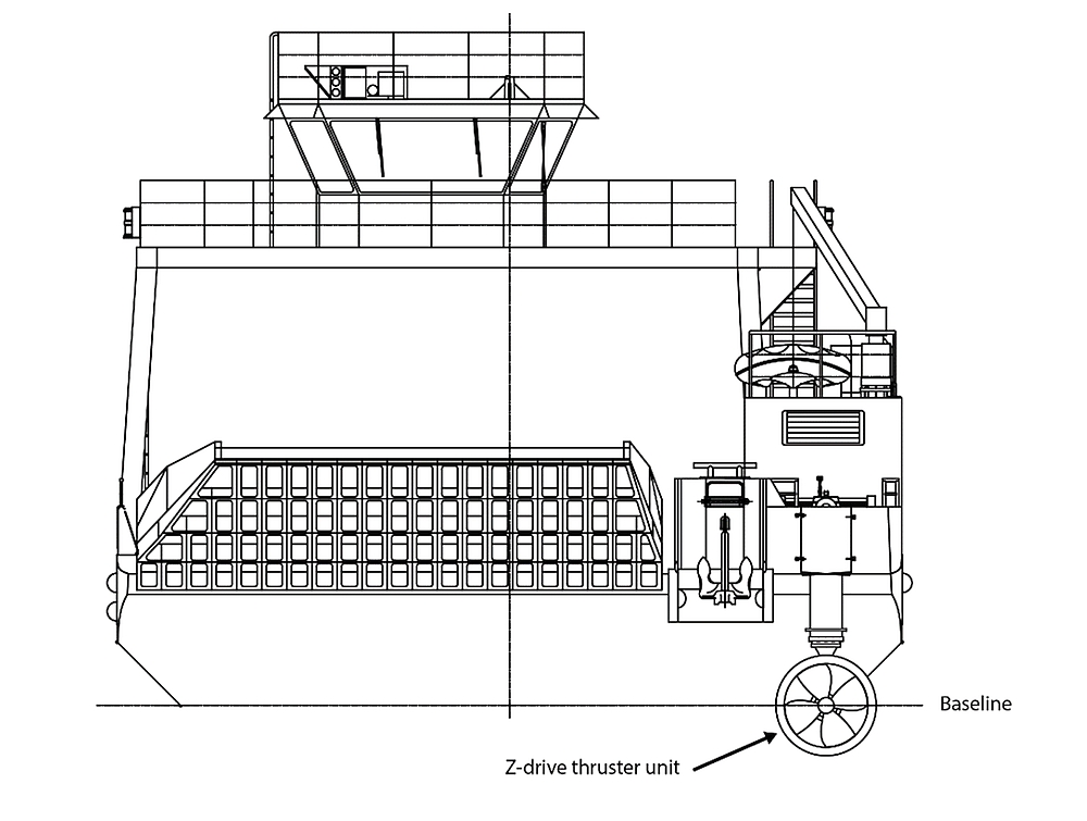 The vessel propulsion consists of two 373 kW (500 BHP) diesel engines that drive 2 independent azimuth thrusters in a Z-drive arrangement. The thrusters are positioned at each end of the vessel and completely off to one side, directly below the superstructure. These thrusters are able to rotate 360 degrees, which quickly changes the direction of thrust and eliminates the need for a conventional rudder. Each thruster is controlled independently by a corresponding rotating joystick on the bridge; the thruster’s position and revolutions per minute are displayed near its corresponding joystick.