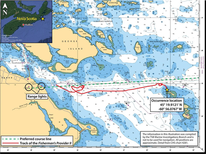 At the time of the occurrence, the channels in the harbour at Canso were marked on the chart used by the master of the Fisherman's Provider II with navigational aids consisting of buoys and range markers with affixed lights.Footnote 8 The vessel's navigation equipment (electronic chart plotter system and radar) was operating at the time of the occurrence.