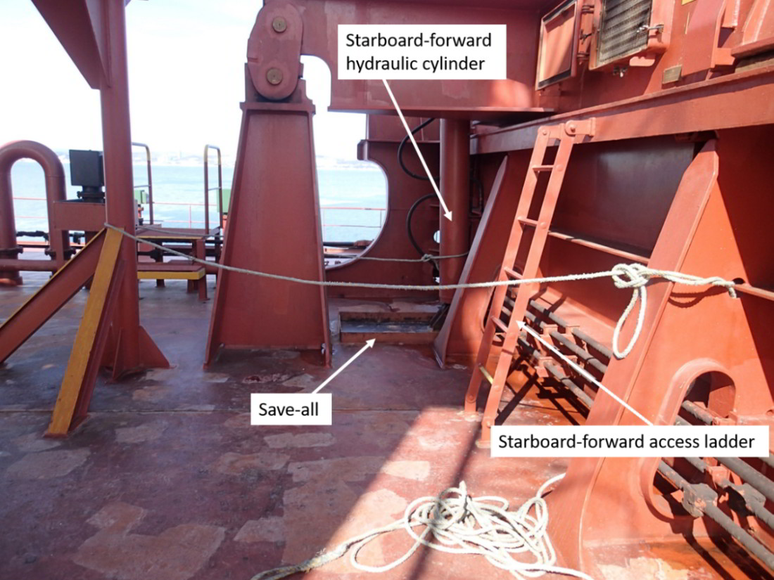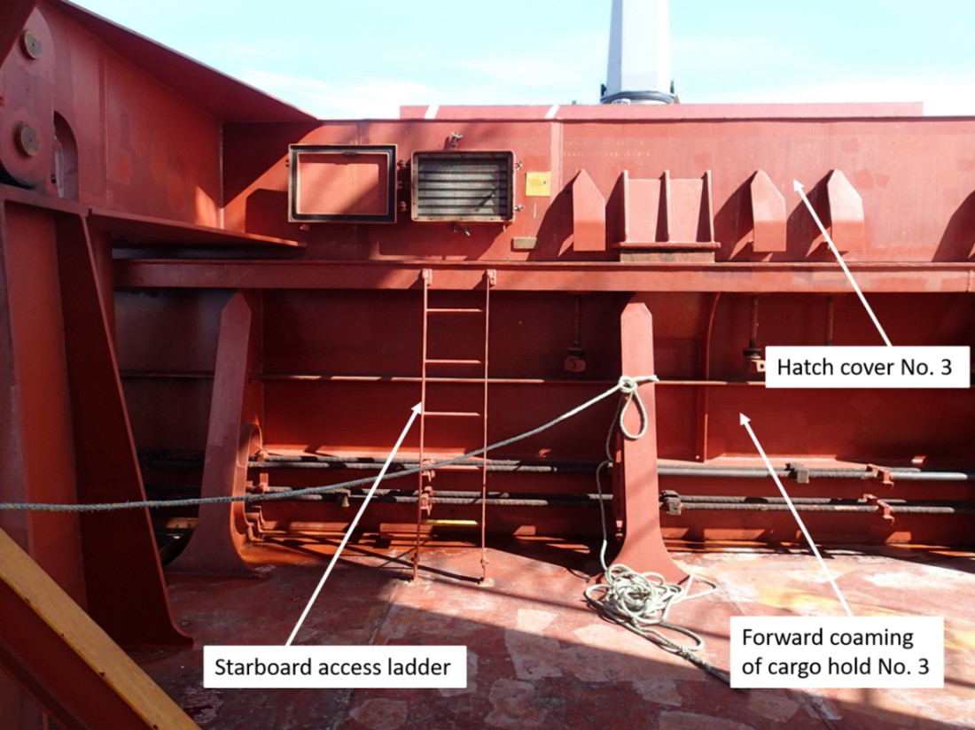 At the front of cargo hold No. 3, there are 3 access ladders 1.76 m high. The ladders are bolted to the main deck and to the top of the hatch coaming. Two are positioned near the port and starboard hydraulic cylinders, and one is positioned on the centreline of the vessel (Figure 2).