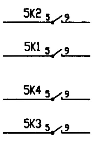 Although relays 5K1, 5K2, 5K3, and 5K4 are theoretically compatible for use with the 24 VDC/30 watt solenoids they were controlling, this particular model of relay was designed as a general-purpose type C transfer contact relay. This type of relay is not suited for voltages that exceed its 28 VDC rating, which are generated when the contact is broken by the counter-electromotive force inherent to the inductive load created by the solenoid. Other types of relays are specifically designed to better handle the severe conditions produced by these inductive loads.
