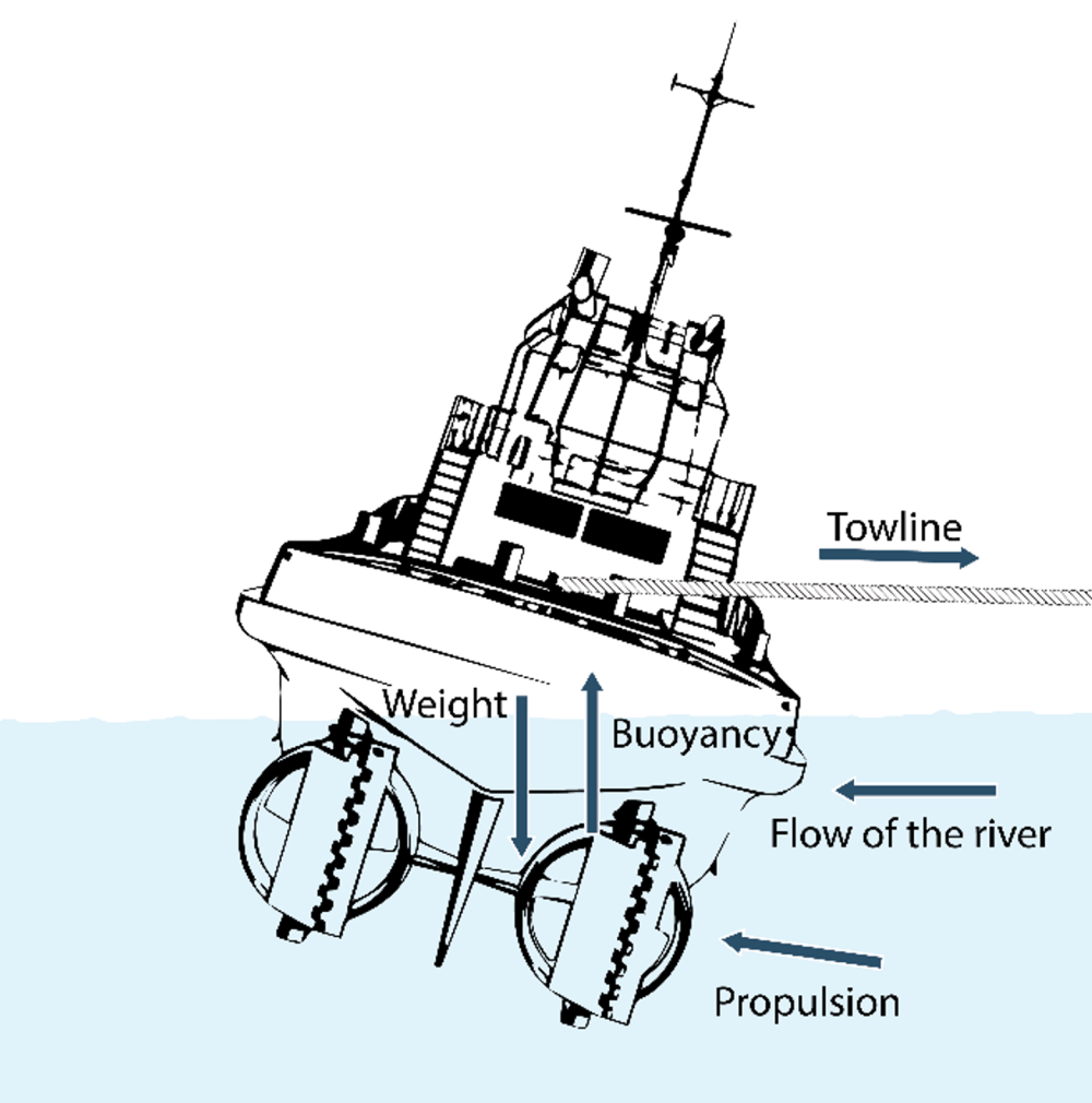 - The master applied full starboard rudder and full throttle; however, given the forces acting on the vessel's stability, such as thrust from the propellers, flow of river against the hull, and increasing force from the towline, this action increased the tug's heel.