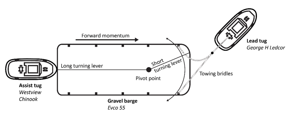 At the time of the occurrence, the George H Ledcor was towing the loaded gravel barge Evco 55 up the north arm of the Fraser River. The assist tug, the Westview Chinook, was being used to increase the barge's speed to arrive in time to land the barge in the preferred tidal conditions. After successfully navigating 2 bends in the river, the George H Ledcor attempted to pull the Evco 55 to port to navigate a third, slightly larger bend in the river. However, the George H Ledcor was unable to change the direction of the loaded barge, due in part to the assist tug pushing on the stern.