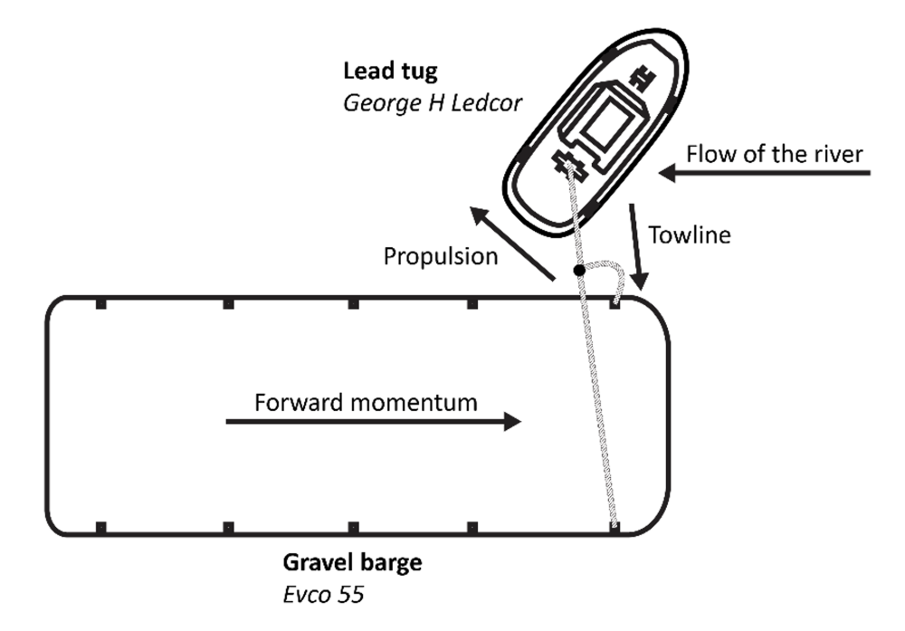- Specifics of the tow: The crew must know and evaluate the size, weight, draft, hull design, and pivot point of the tow. For example, when an assist tug is pushing the tow, the crew needs to know how the tow's pivot point can affect the lead tug's ability to manoeuvre the tow.