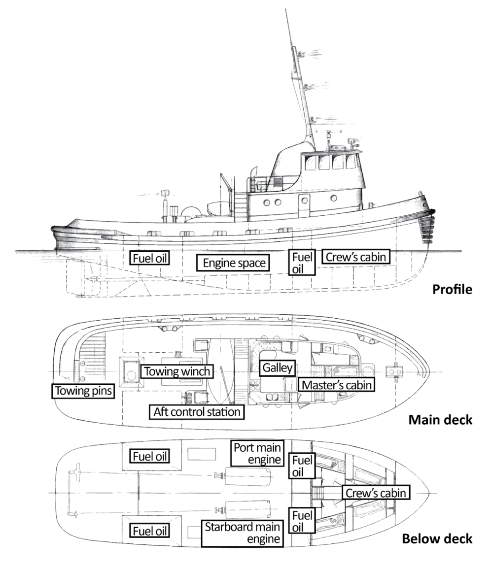 The George H Ledcor (Figure 1) was a conventional coastal tug of steel construction used primarily for river and coastal towing. The general arrangement of the vessel is shown in Appendix A. The deckhouse, located on the fore part of the main deck, was fitted with watertight doors on both the port and the starboard sides. The main deck had 3 watertight hatches leading to the machinery and the crew's cabin located below deck. The crew's cabin was located forward in the forecastle and could accommodate 4 crew.