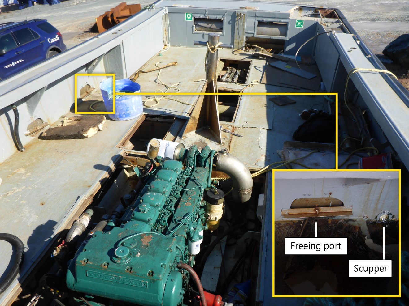 By contrast, as an undecked vessel, the Captain Jim relied on freeboard provided by its watertight hull for buoyancy and stability. Without the freeing ports, the Captain Jim’s freeboard extended to the top of the gunwale. However, when the freeing ports were added, the vessel’s average aft freeboard was reduced from 0.9 m to approximately 0.1 m. The addition of freeing ports to the Captain Jim’s hull reduced the vessel’s freeboard and rendered it vulnerable to water ingress. The Captain Jim was an undecked vessel, and so any water that entered through the freeing ports accumulated on deck, passed down through the non-watertight hatches in the deck, and entered the vessel’s bilge.