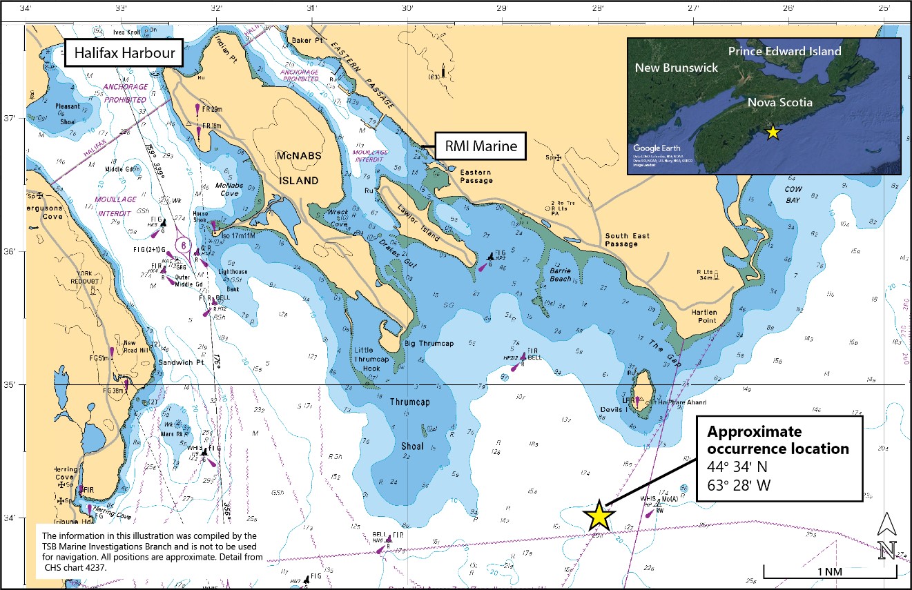 At approximately 2145Footnote 1 on 28 January 2019, the Captain Jim departed the RMI Marine dock in Eastern Passage, Nova Scotia, with the master, a deckhand, and a passenger on board. All 3 were wearing personal flotation devices. The purpose of the voyage was to transport the passenger to an oil tanker anchored in the approaches to the Halifax Harbour, where he was taking samples of the cargo, and then return him to Eastern Passage. The trip was approximately 7 nautical miles (NM) each way.