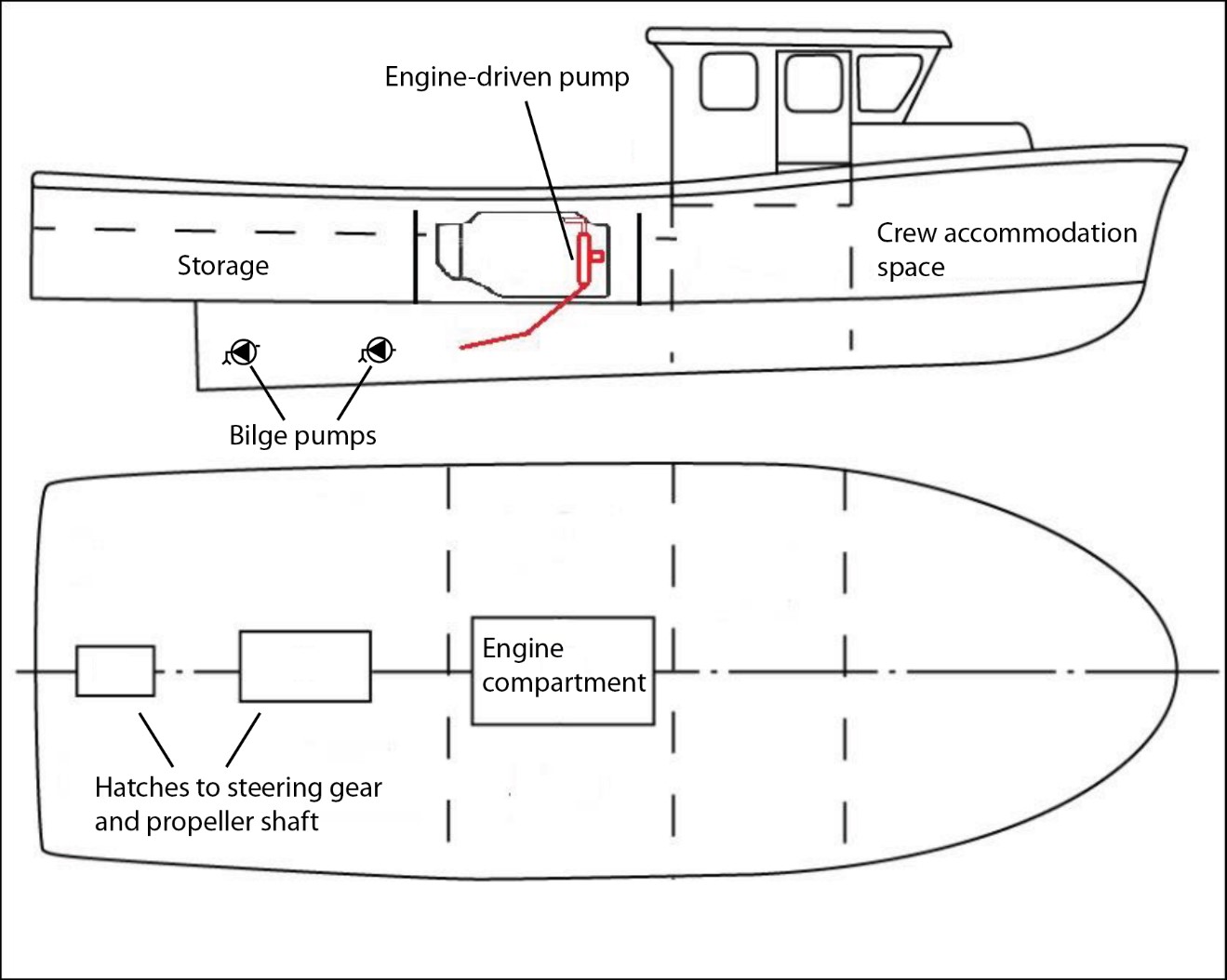 The vessel was fitted with 2 electric bilge pumps and 1 engine-driven pump. One bilge pump was located forward, in the engine compartment, and was set to activate automatically if triggered by a float switch in the bilge. The other bilge pump was located aft, in the lazarette, and was activated manually using a switch in the wheelhouse. The engine-driven pump was located in the engine compartment (Appendix A). It was designed to be used as a firefighting pump to assist other vessels but was generally used as a washdown pump for cleaning the deck; it could also be used to pump the bilge.
