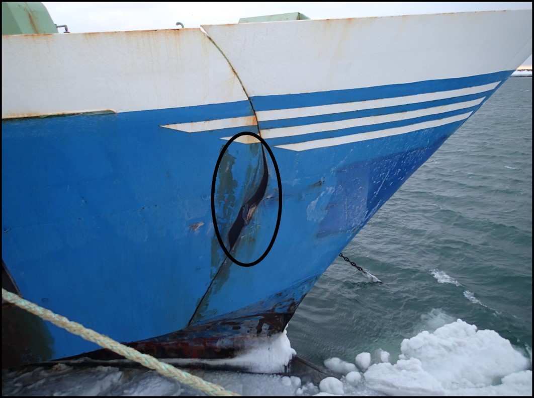 The Apollo was damaged where the bow visor and the hull connect (figures 4 and 5). The shell plating was pushed in and dented over about 1 m, which resulted in a gap between the bow visor and the hull about 0.3 m wide at its maximum. There was also structural buckling around this area. The STQ permanently removed the Apollo from service on 19 March 2019 as a result of the damage caused by the striking.