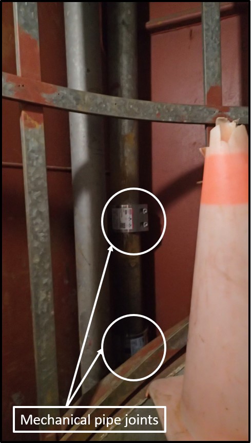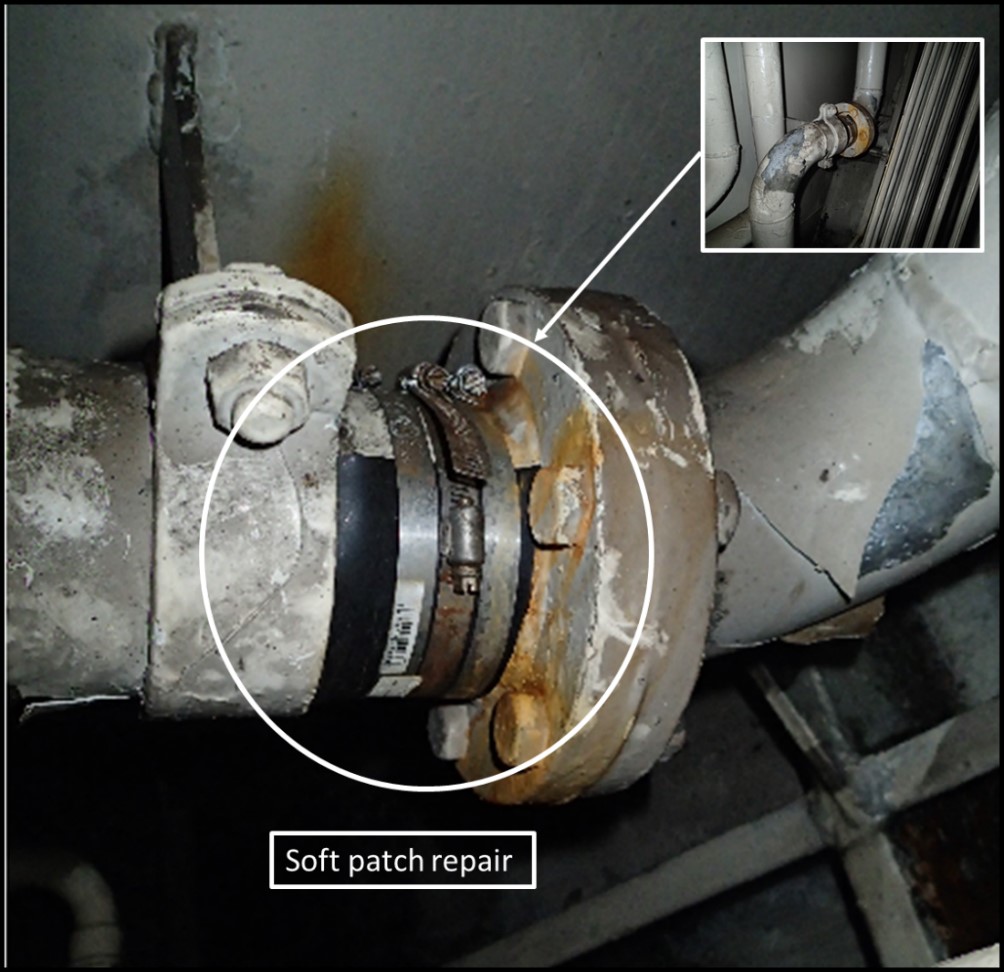 - Some sections of the fire main were corroded and leaking, and there were several soft-patch repairs and mechanical pipe joints along it (Figure G10). One section of the fire main was leaking into a staircase between deck 2 and deck 3 (Figure G11).