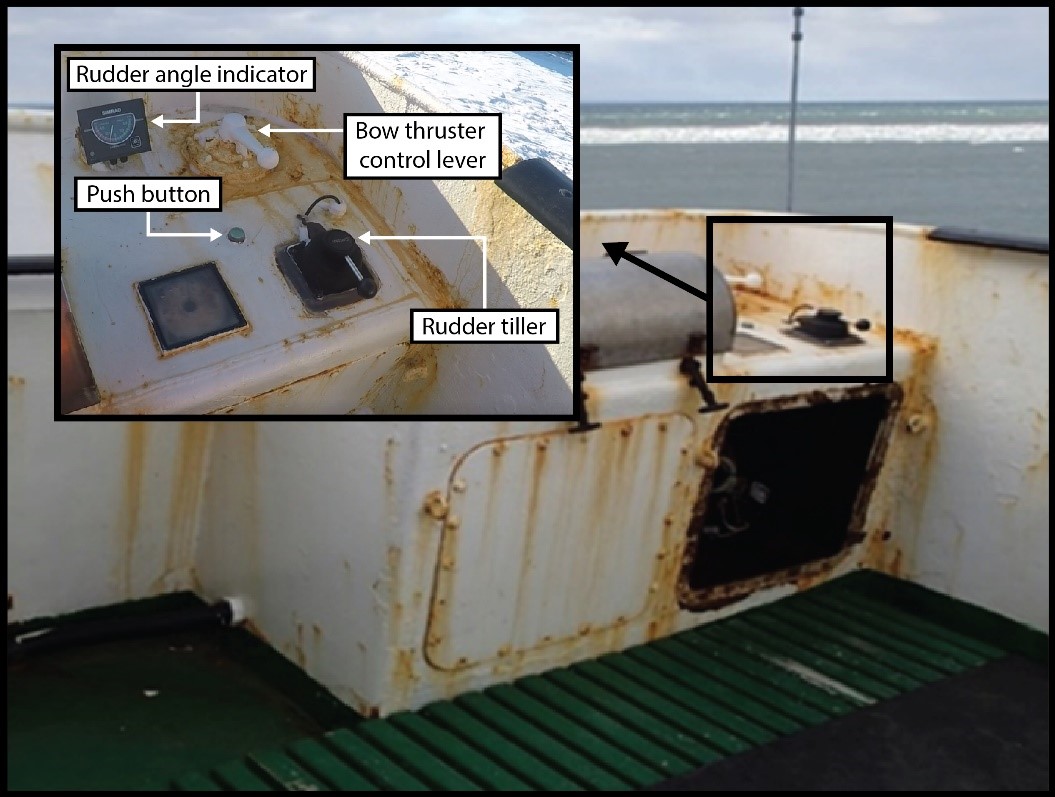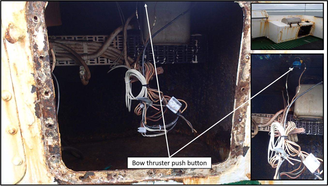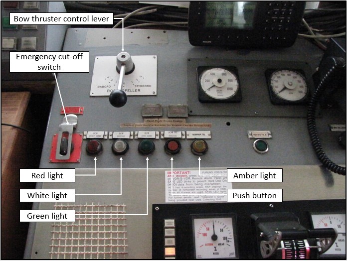 The engine room crew, still monitoring the bow thruster’s ammeter, noted that it showed no electrical consumption as the vessel was manoeuvring. The chief engineer called the bridge team and asked if the bow thruster was in use. The helmsman answered the call and, after noting that the white and amber indicator lights for the bow thruster on the bridge console were lit, provided an affirmative response. This light combination indicates that the bow thruster is activated and control is at the bridge console.