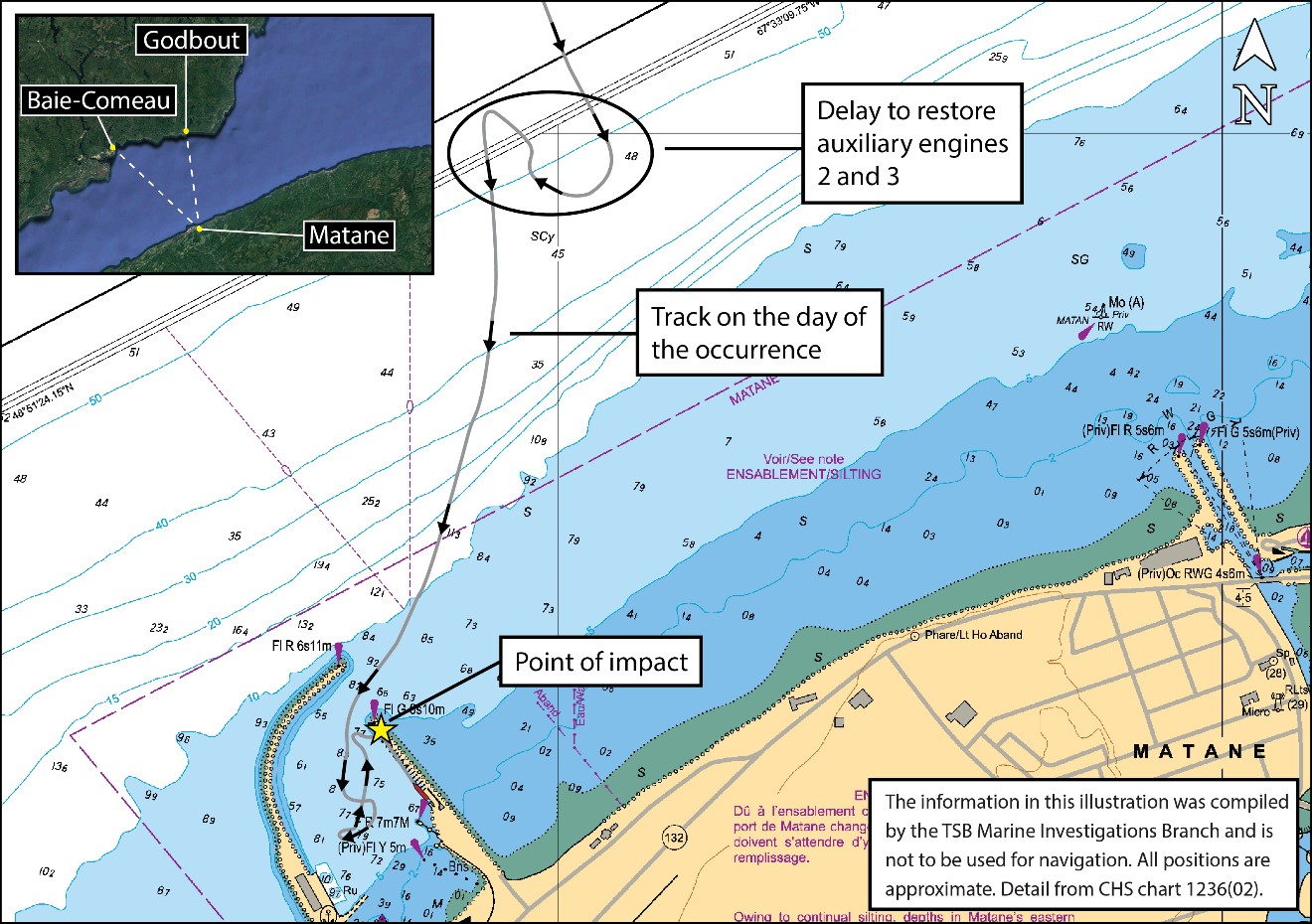 At 1903, the master called STQ personnel in Matane to inquire about the wind speed in the port. The master was informed that the wind speeds had increased beyond those originally forecast upon departure and were now between 35 and 40 knots. At 1908, the vessel was approximately 2 NM from Matane when the master received a call from the engine room crew. They informed him that 2 of the generator sets had shut down automatically when their overheat sensors had activated because of seaweed and debris blocking one of the strainers on a cooling line. The engine room crew had kept the 3rd generator set running by switching over to the other strainer on the cooling line. The engine room crew asked the master to give them some time to resolve the situation before proceeding to dock in Matane (Appendix D).