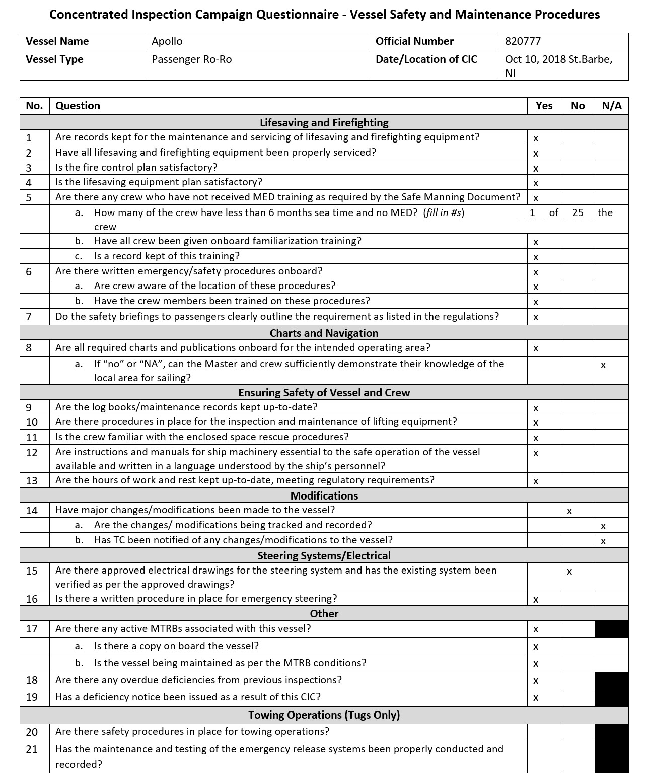 | 25 February 2019 (following the Apollo’s striking of the wharf in Godbout) | Godbout, QC | TC | TC compliance inspection |
