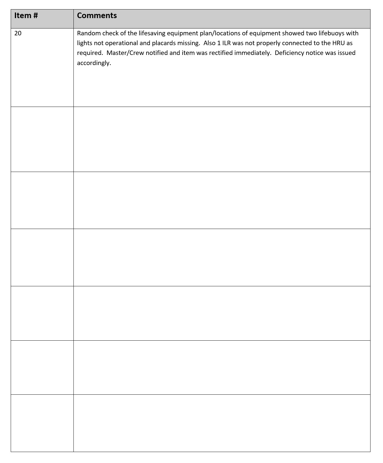 The STQ team master contacted another STQ master who had many years of experience and expressed his concerns about the Apollo’s condition and the oversight being provided by the Apollo’s RO. A TC marine safety inspector (MSI) happened to be with the STQ master who received the call and and then explained the situation to the MSI. The MSI then called the STQ team master. The STQ team master informed the MSI of his concerns about the oversight of the vessel by the RO and the vessel’s overall condition, pointing out issues with life boats, leaking decks, storage of life jackets, leaking fire lines, and non-operational fire stations. The STQ team master also informed the MSI that he had a preliminary list of deficiencies to report. The MSI informed the master that he should address his concerns to the vessel’s RO and, if he was still dissatisfied, he should then contact TC. The master sent the preliminary list of deficiencies to a TC office on 22 January. He did not pursue the issue further, having raised the concerns with both STQ management and TC.