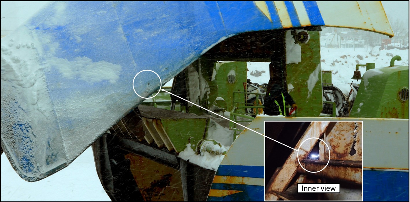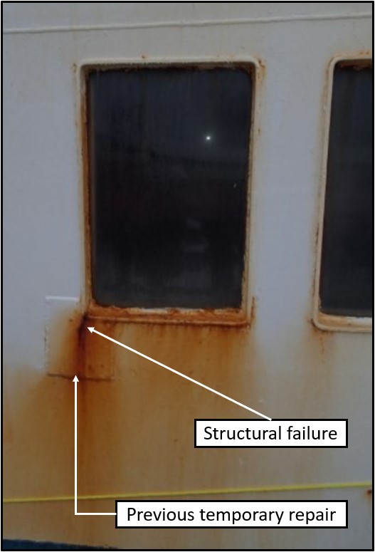- The vessel’s superstructure had a crack of approximately 10 cm that extended from the lower corner of one of the windows (Figure G6). At some point in the past, a plate had been welded over the crack, but the temporary repair had since failed.