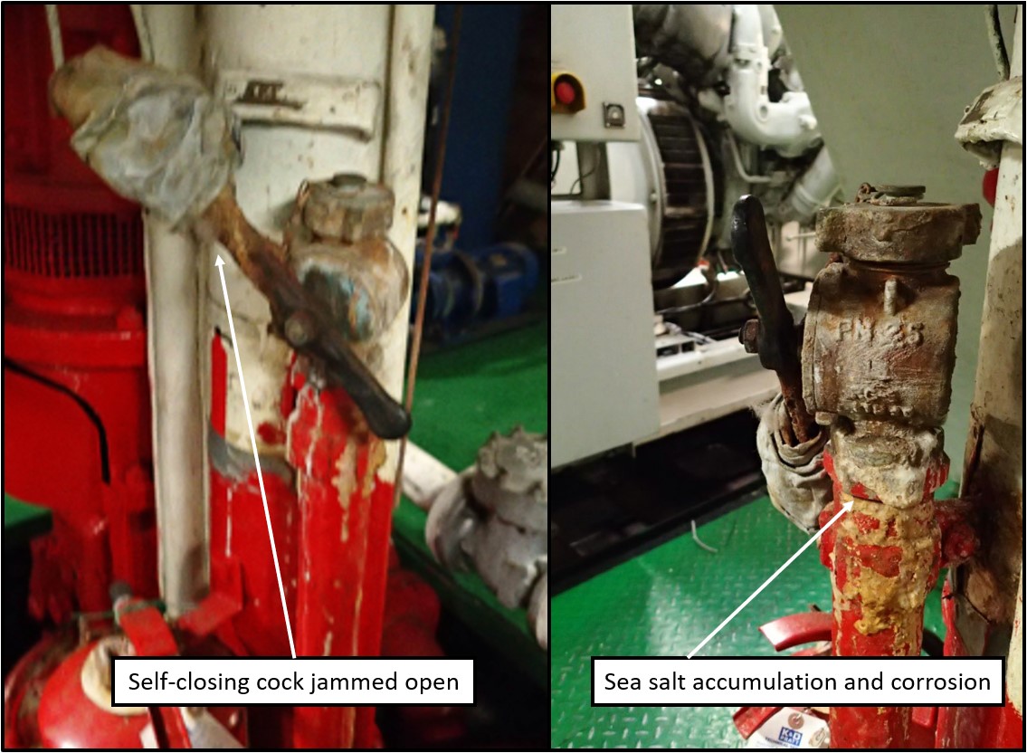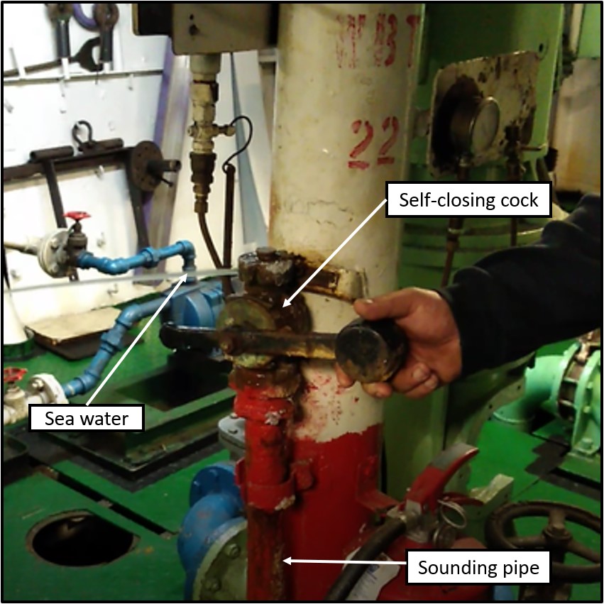 - The self-closing cocks on 2 of the sounding pipes for the vessel’s double-bottom tanks were jammed open due to the presence of rust and salt residue (Figure G2).