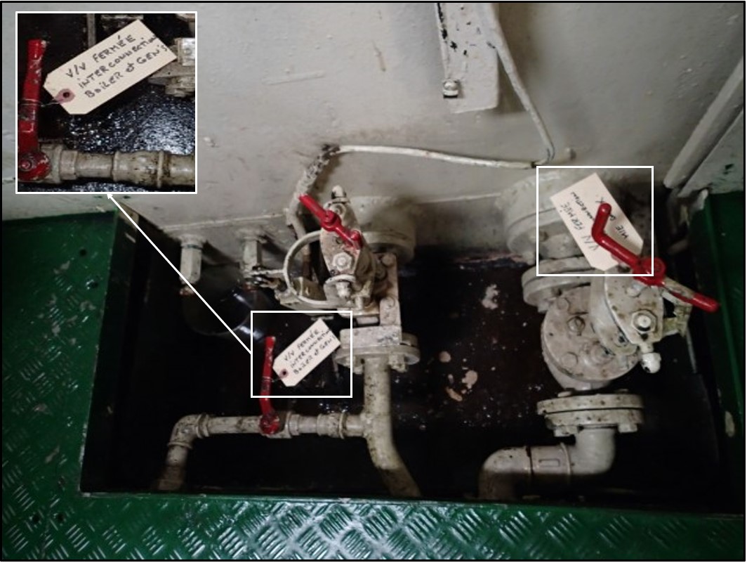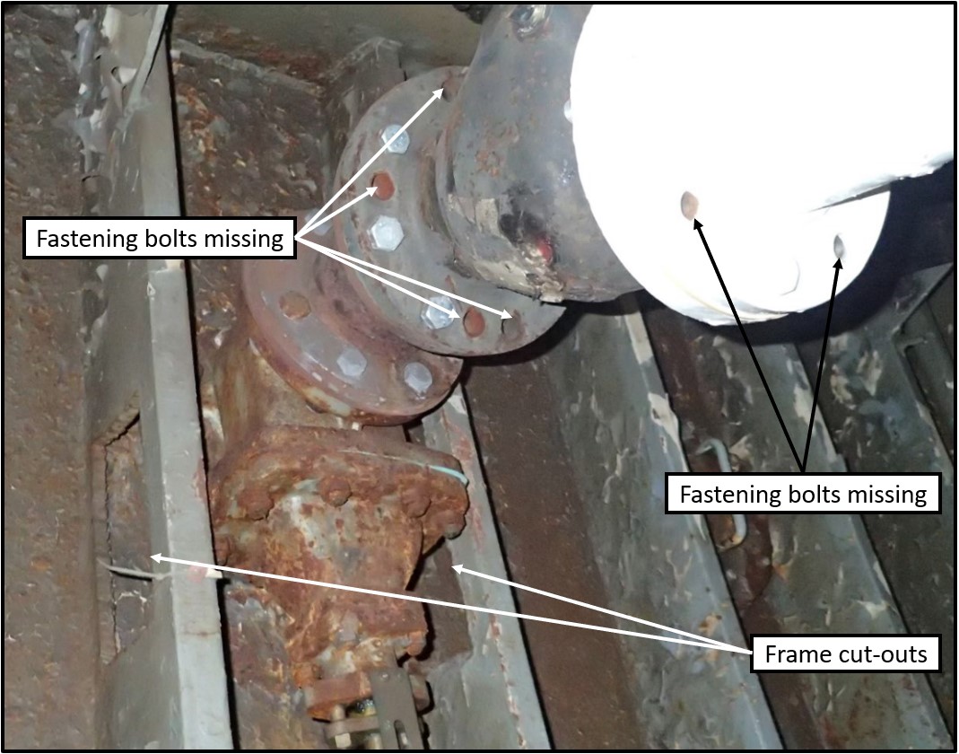 - The valves used for discharging sea water overboard were missing some of the bolts that secured the valves ship-side (Figure G4).