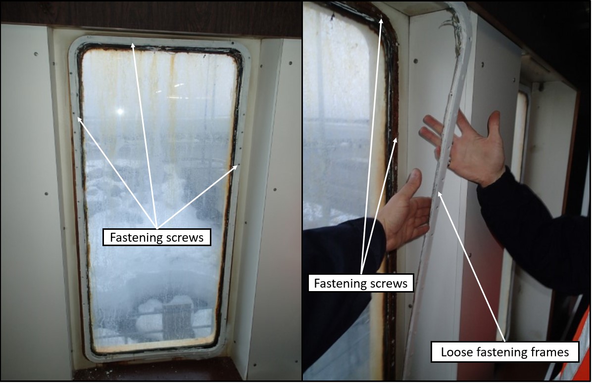 - The aluminum frames used to fasten tempered glass windows located below the vessel’s downflooding point were corroded around the screw holes and, in some places, the frames were no longer attached to the surrounding structure (Figure G5).
