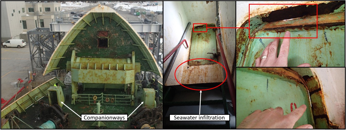 - A combination of rust and deteriorated rubber seals had resulted in the doorframes and doors in the companionways on the foredeck no longer being watertight (Figure G7).