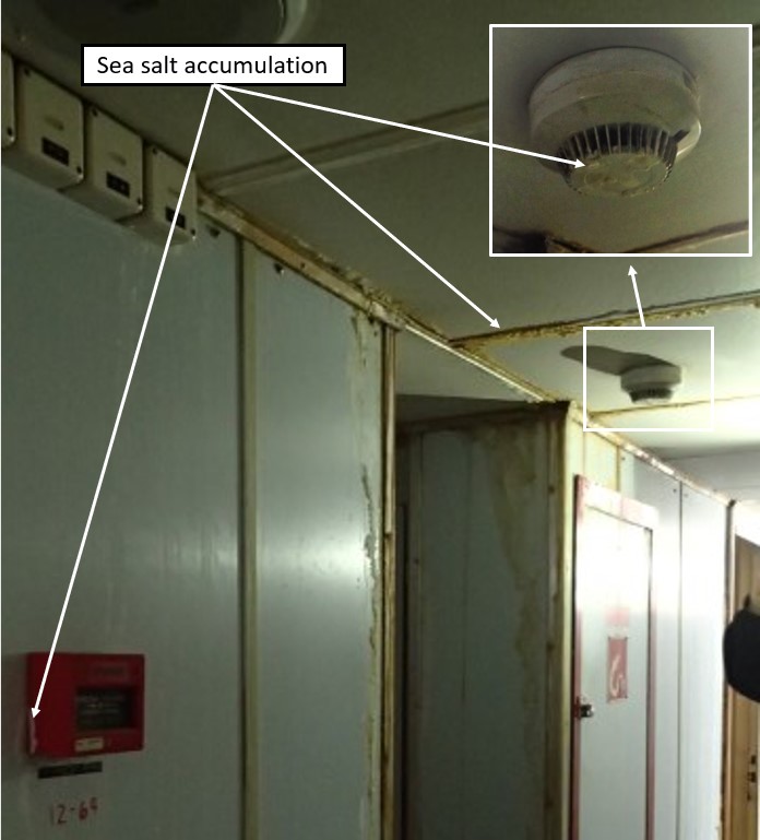 - Some of the fire and smoke detectors in the vicinity of the fire main in the ceiling on deck 2 had sea water damage (Figure G9).