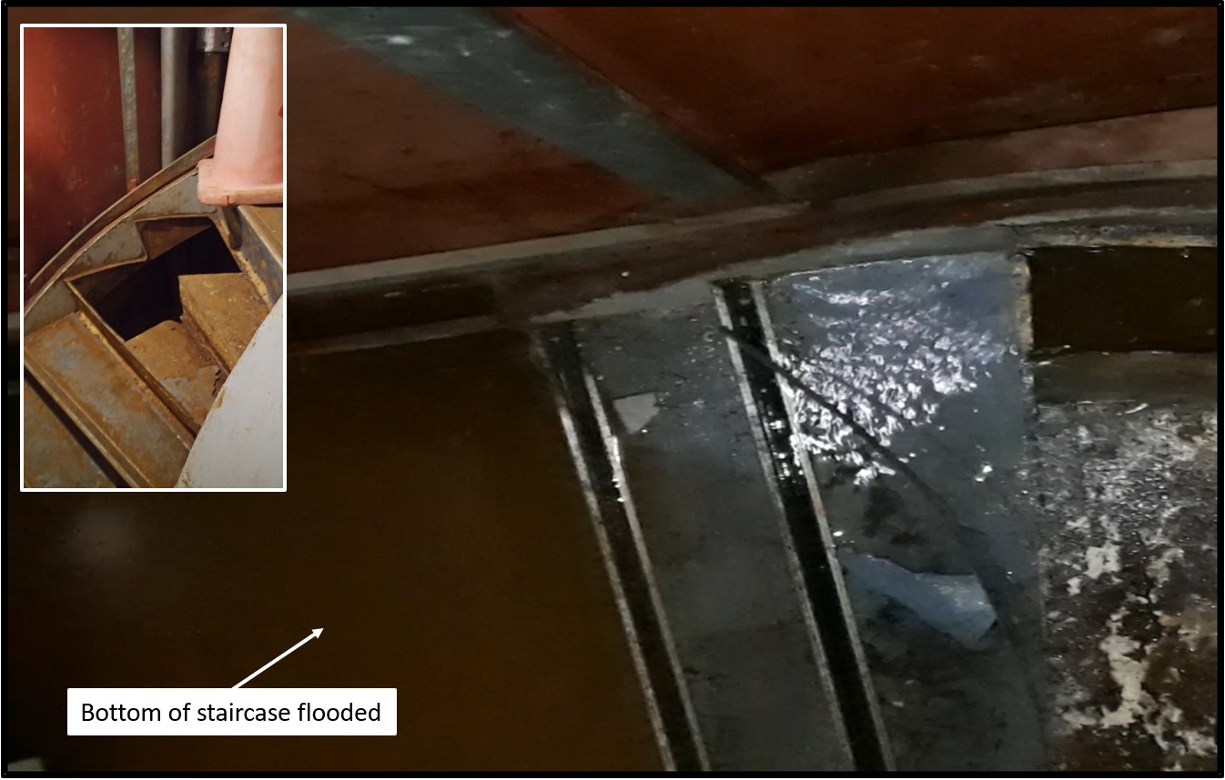 - One of the vessel’s double-bottom ballast tanks (No. 22) was pressurized and water continuously shot out of it into the engine room when the sounding pipe was open (Figure G3).