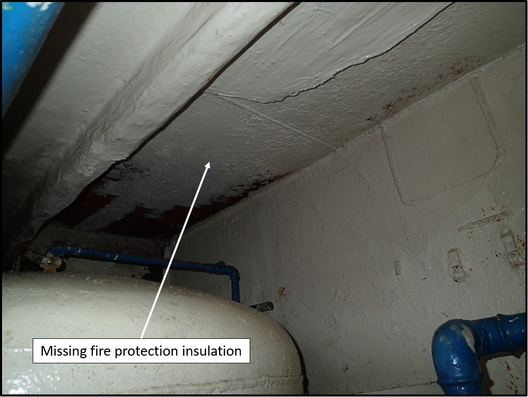 - Some of the bulkheads in the engine room that were intended to be fire resistant did not have the required fire protection insulation to prevent fire propagation (Figure G13).