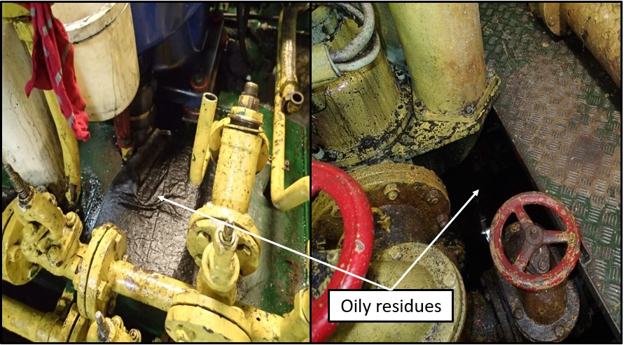 - Oil residue was present throughout the main and auxiliary engine rooms, as were contaminated rags and oil absorbent pads, which are all fire hazards (Figure G14).