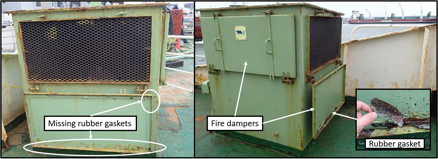 - Some of the rubber gaskets around the fire dampers on the vessel’s air intake ducts no longer formed an airtight seal when the damper was closed (Figure G16).