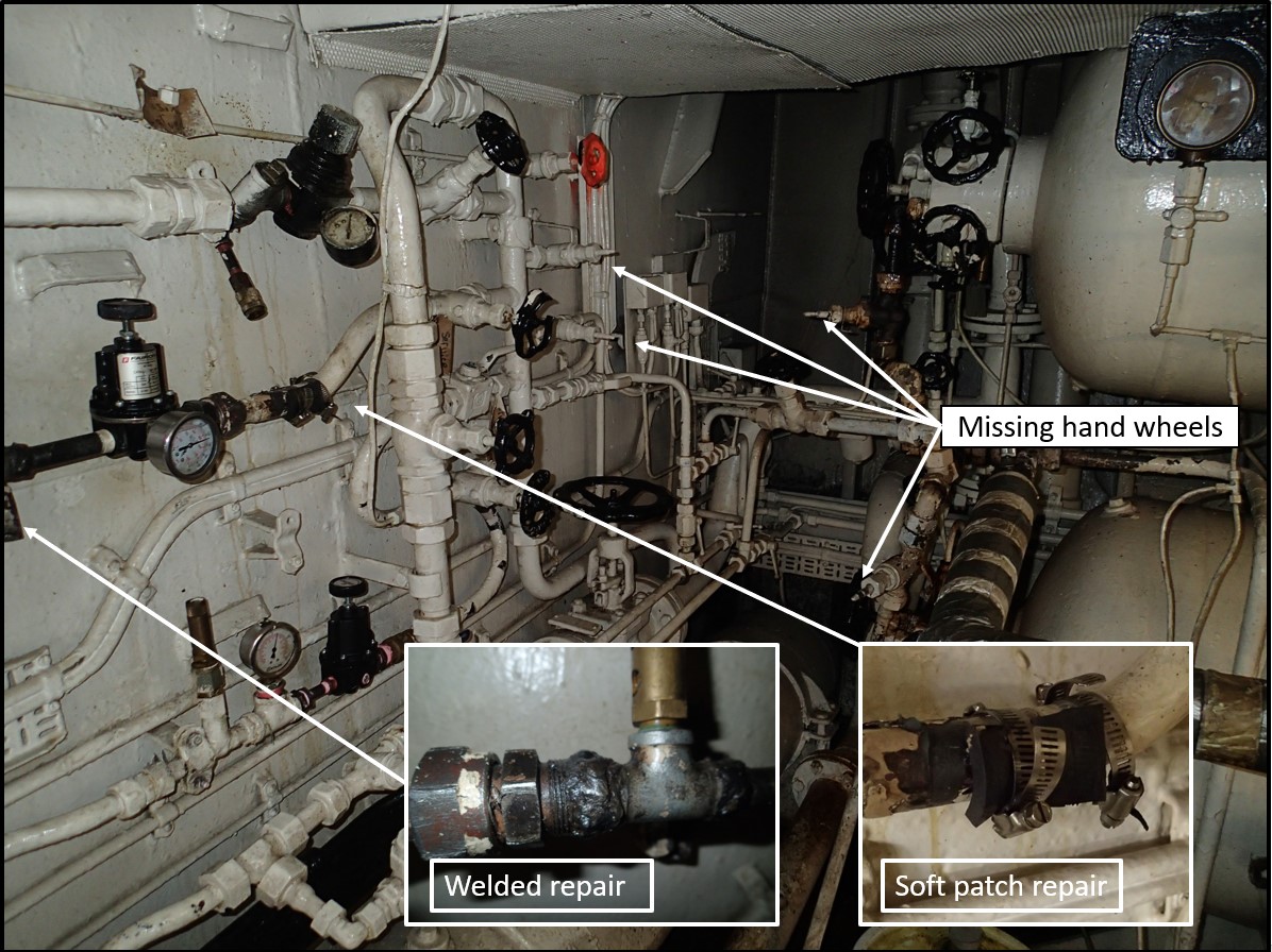 - One of the vessel’s pressurized air lines had welded repairs and soft-patch repairs along it (Figure G19).