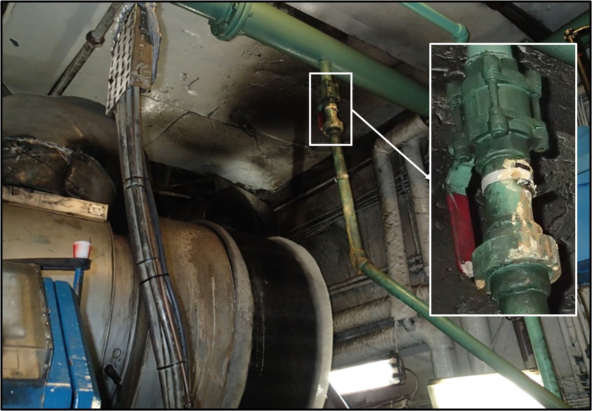 - A section of the fire main in the engine room above one the main engines had salt residue where it had leaked around a soft-patch repair (Figure G20).