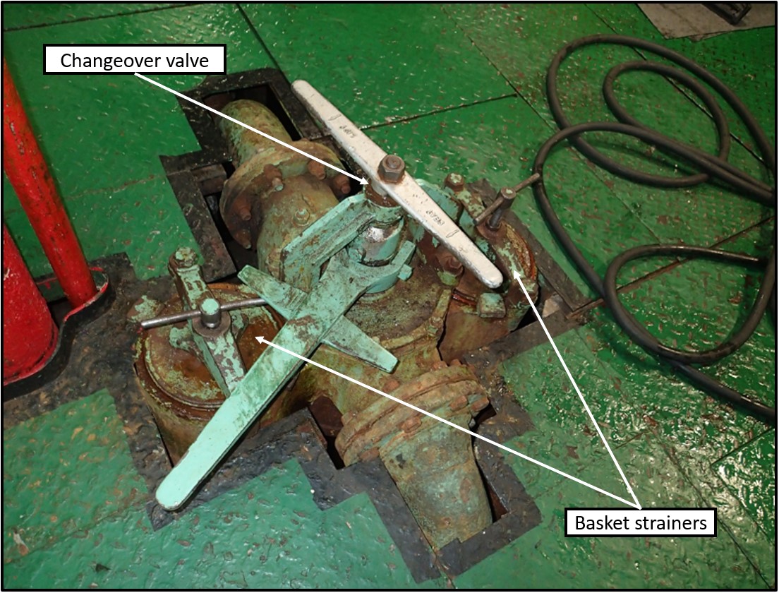 - The changeover valve for a duplex strainer on a cooling line for auxiliary machinery was leaking (Figure G26).