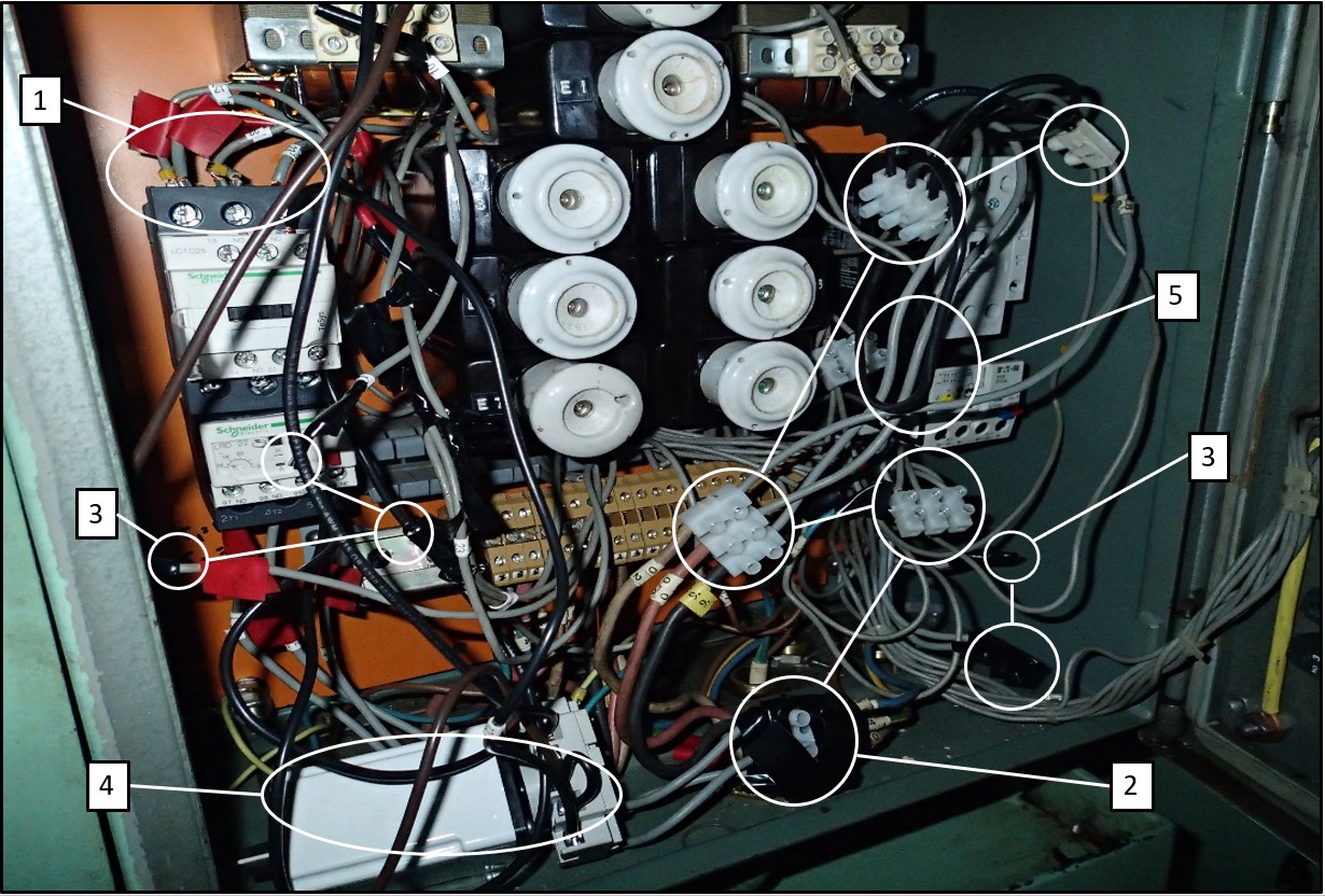- In the control panel used to operate the hydraulic sliding doors, the electrical wiring did not meet the requirements of TP 127 - Ships Electrical Standards.Footnote 99 With reference to (Figure G29), the following was noted: