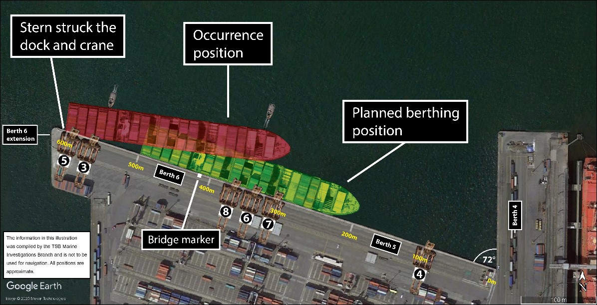 The report on the TSB simulation analysis of berthing conditions at Vanterm identified that a vessel of the Ever Summit’s size and design approaching the berth at Vanterm at an angle greater than 3° can result in the vessel contacting the berth, its fittings, or shore cranes, particularly at high tide. The investigation also determined that the energy absorption capacity of the fendering systems, the clearance between the waterside crane rail and the berth line posed hazards. These factors, as well as the suitability and location of mooring bollards and vessel spacing at the berth, need to be carefully evaluated, particularly in light of the greater displacements, length overall, and higher freeboards of large container vessels.