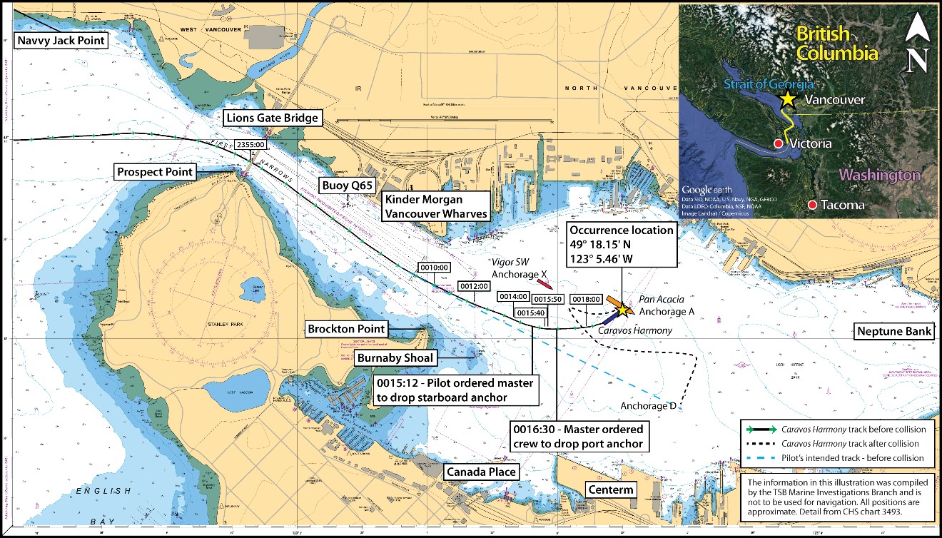 On 17 March 2019, the bulk carrier Caravos Harmony, under the conduct of a pilot, was proceeding to an anchorage in Vancouver Harbour, British Columbia, when it struck the anchored bulk carrier Pan Acacia. Both vessels sustained damage. No pollution or injuries were reported.