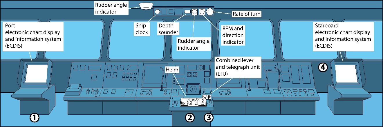 In the same console as the LTU lever, there are digital displays for rpm and the direction of the engine’s rotation. There is also a bridge movement recorder which records telegraph movements on a printer. There is one other rpm indicator on the bridge above the bridge midship window in front of the steering console. This indicator provides information about the status and direction of the main engine’s revolutions. It is visible from the ECDIS on the port side of the bridge (Figure 8), which is where the pilot was standing throughout the voyage. The pilot’s portable pilot unit was also at this location.