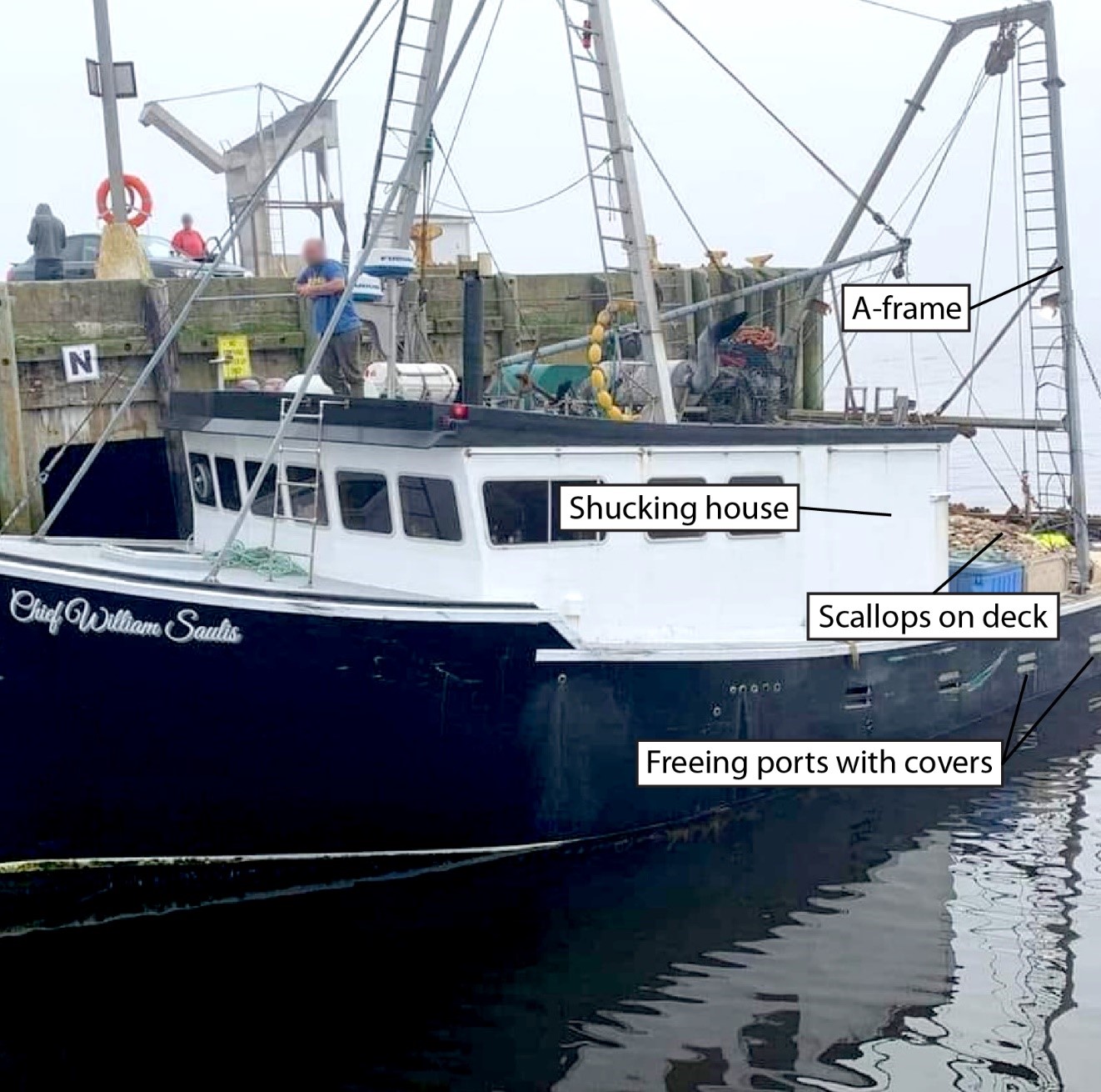 When harvesting scallops, the Chief William Saulis would typically make a multi-day trip. The Chief William Saulis had begun fishing out of Digby in September 2020, and had made 8 earlier trips, landing an average of 1600 kg of shucked scallops per trip. At the time of the occurrence, the Chief William Saulis was carrying an estimated load of 1600 kg of shucked scallops, 230 kg of which was stowed on deck. The unshucked scallops, approximately 2700 kg, were piled up to approximately 5 ft high on deck and in totes and baskets.Footnote 14 An unshucked scallop can measure 7.5 cm to 15 cm long. When loose on deck they can pile against freeing ports, reducing the ports’ ability to shed water. The total weight of scallops on board was approximately 4300 kg.