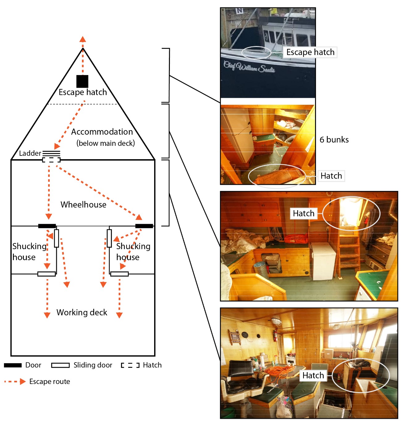 Crew members who started in or reached the wheelhouse needed to go through one of the shucking houses, through either the inboard or aft sliding doors. The aft doors closed toward the centre of the vessel and could have been difficult to shift if the angle of list was large or if the vessel had capsized.