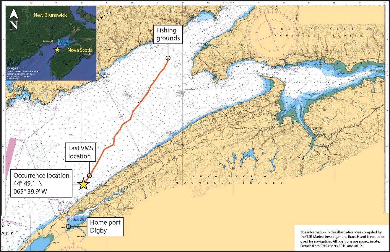 At 0500, when the last VMS position was received,Footnote 8 the vessel’s heading was 195° magnetic and the speed had been further reduced to 5.4 knots. At 0551, the vessel’s EPIRB activated approximately 3.4 NM south-southwest from the last VMS position. In response, search and rescue coordinators at the Joint Rescue Coordination Centre (JRCC) in Halifax retrieved the vessel information, contacted the general manager of Yarmouth Sea Products Limited (YSP), and attempted to contact the vessel by the master’s cellphone and by VHF radio. When no response was received, search and rescue efforts began. Three Canadian Armed Forces aircraft, 3 Canadian Coast Guard (CCG) vessels, and numerous private vessels were deployed in the search. At 0740, search and rescue coordinators requested information from YSP, including the total number of people, on-board safety equipment, a crew list and medical conditions of the crew. Two inflated life rafts, a fully opened immersion suit, a lifejacket, and miscellaneous debris were recovered after being initially discovered at 0830.