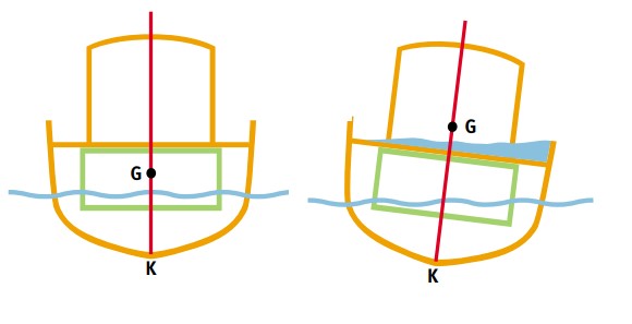 When cargo, gear, and water in tanks or on deck are able to move freely with the motion of the vessel they shift the centre of gravity, where their weight is acting, and so change the stability of the vessel (Figure 5). This effect, called the free surface effect, results from the changes in the centre of gravity as the materials move. The severity of a free surface effect increases with the weight of the material and the distance moved. The free surface effect becomes particularly severe when the materials, such as water trapped on deck, are able to shift along the entire width of the vessel.