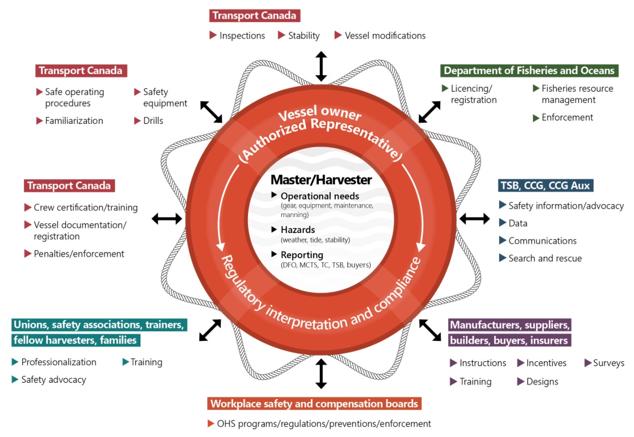Regulation and oversight of safety in commercial fishing operations is a responsibility shared by individual masters and authorized representatives (ARs) and governed at the federal and provincial levels. At the federal level, the Canada Shipping Act, 2001 (CSA 2001) requires the master of a vessel to take all reasonable steps to ensure the safety of the vessel and of persons who are on board. Footnote 20 The CSA 2001 also defines the role of the AR, who is by default the vessel owner, or is a person named by the vessel owner. Footnote 21 The CSA 2001 requires the AR to act with respect to all matters related to a vessel that are not otherwise assigned to any other person. Specifically, a vessel’s AR is responsible for ensuring that the vessel and its machinery and equipment meet all applicable regulations; for developing procedures to safely operate the vessel and to deal with emergencies; and for ensuring that crew members receive safety training. Footnote 22