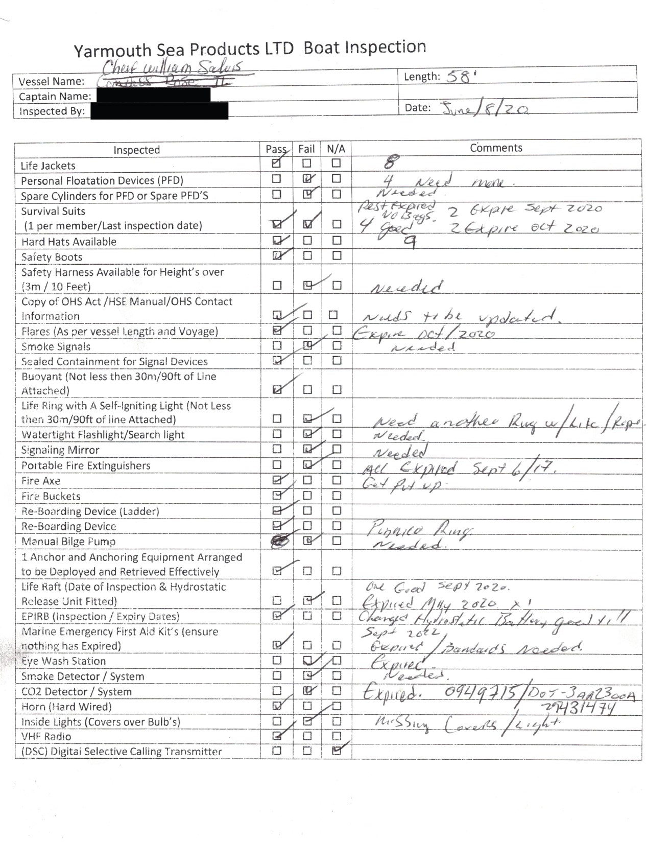 - Yarmouth Sea Products Limited did not have an up-to-date crew list for the Chief William Saulis before the vessel departed for the fishing grounds. Yarmouth Sea Products Limited was unable to provide the Joint Rescue Coordination Centre with the total number of persons on board until 26 hours after the occurrence.