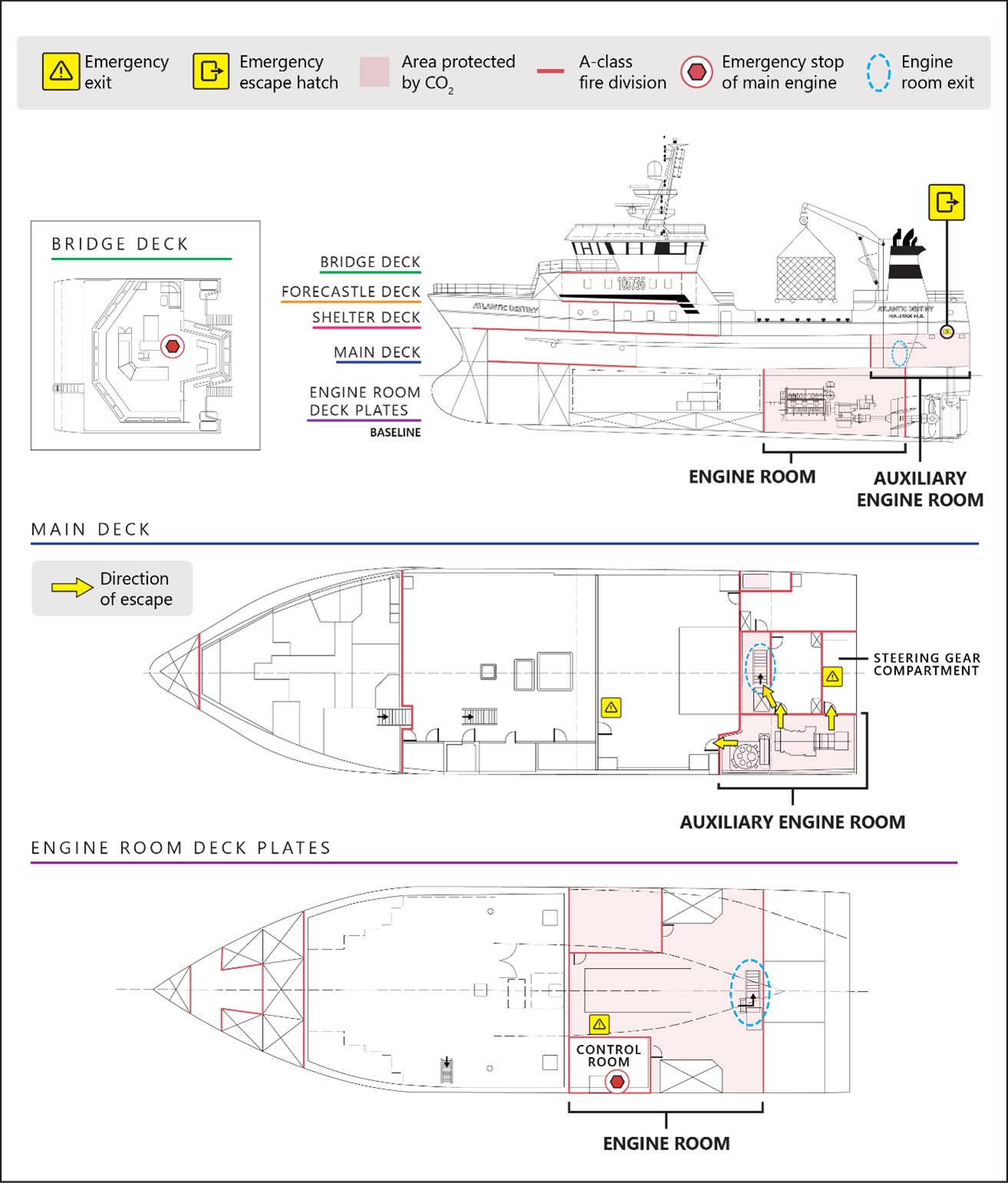 While still in the ECR, the second engineer donned an emergency escape breathing device (EEBD).Footnote 6 He left the ECR and tried to escape through the emergency escape hatch that led to the vessel’s processing factory. He could not open the emergency escape hatch and returned to the ECR, took a fire extinguisher, and escaped through the engine room entrance, putting out fires on his way. In the meantime, the chief engineer assembled and donned the second EEBD.Footnote 7 On the stairs leading to the auxiliary engine room, the second engineer met the master and the chief mate. He asked them to open the engine room emergency escape hatch from the processing factory and then returned to the engine room. The master and the chief mate opened the emergency escape hatch from above and the chief engineer escaped the engine room. As the second engineer followed the chief engineer out, the sound of water sloshing was heard.