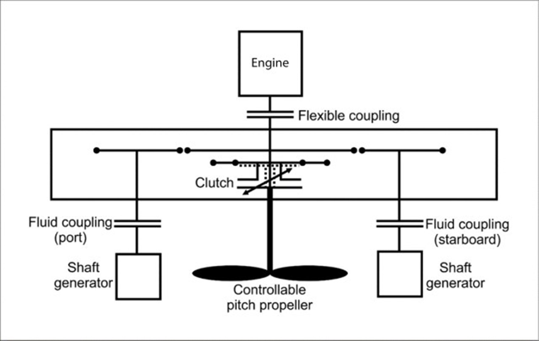 The engine was connected to a combination gearbox via a flexible coupling (Figure 4). There were 3 output shafts from the combination gearbox: the lower output shaft at a 5.52:1 reduction for the propeller shaft, and 2 upper output shafts with fluid couplings, at a 1:2 increase, to drive the shaft generators. The design limit for the fluid couplings was 1800 rpm. At the normal engine operating speed of 900 rpm, the propeller shaft turned at 163 rpm and the generators turned at 1800 rpm.