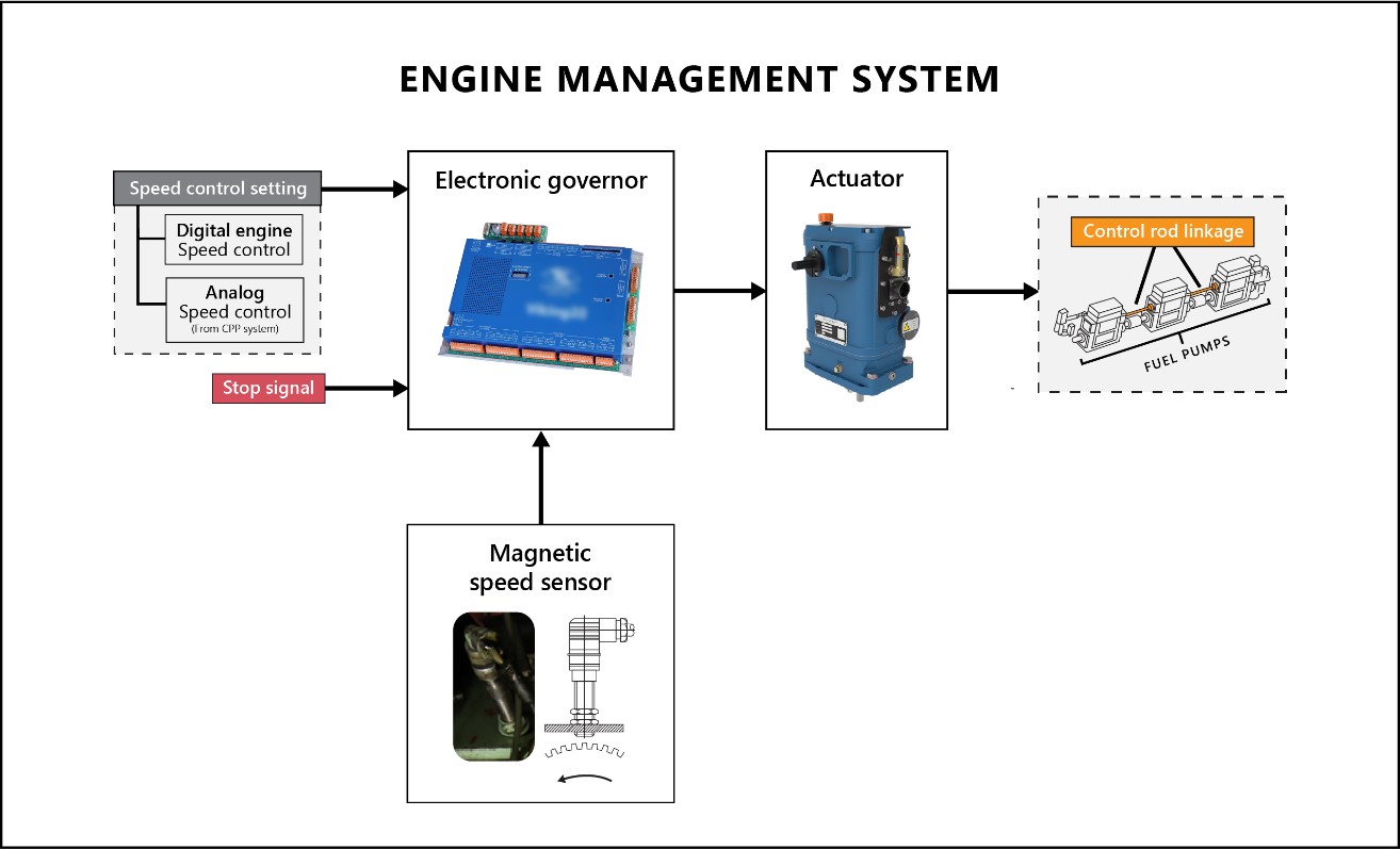 The engine management system had 3 main components: the electronic governor, the magnetic speed sensor, and the actuator. The electronic governor used output from the magnetic speed sensor to provide a signal to the actuator, which governed the amount of fuel supplied to the engine and maintained a constant speed.