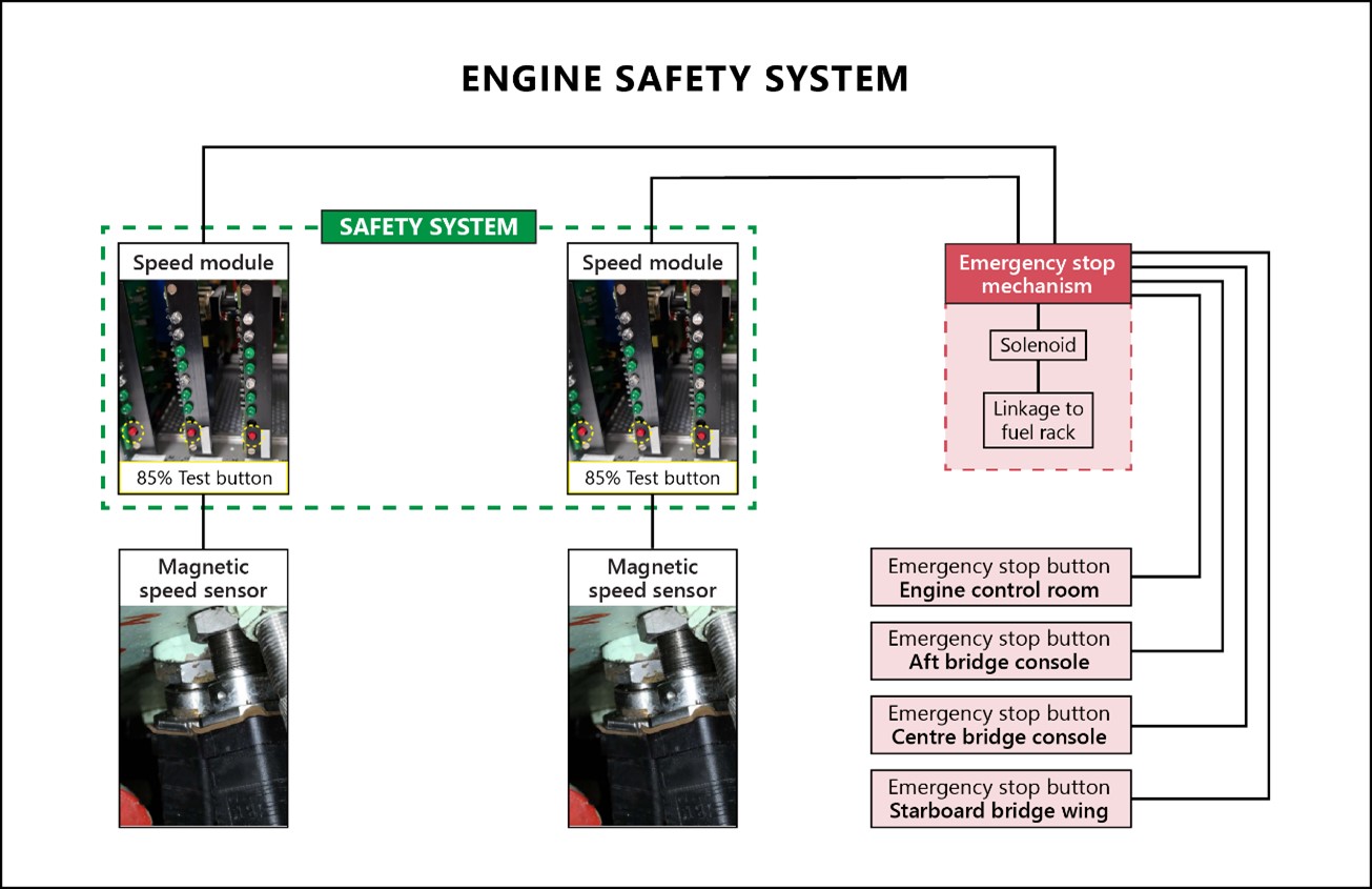 In such a situation, the 2 independent safety loops of the engine safety system are supposed to sense the overspeed and signal the emergency shutdown arrangement to disconnect the fuel rack from the actuator. When the automatic overspeed protection does not work, pushing the engine’s emergency stop button in the engine control room (ECR) disconnects the fuel rack.