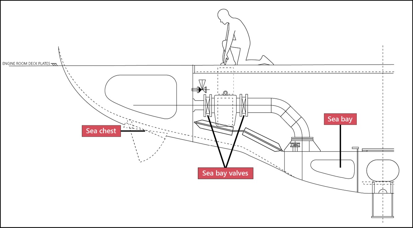 At about 2100, the chief engineer and the second engineer entered the engine room, planning to stop the water ingress by closing the sea bay valves (see Section 1.14.1 Sea bay valves). The second engineer used an SCBA and the chief engineer covered his face with a rag for protection. The chief engineer proceeded along the port side of the engine room and the second engineer along the starboard side. The chief engineer observed that the water had reached the engine room deck plates. Because the chief engineer had difficulty breathing, he was unable to reach the port-side sea bay valves and left the engine room. The second engineer observed that many pipes were smashed or broken. He tried to access the starboard sea bay valves to close them but was unable to do so because of limited space and because he was hampered by the SCBA. He then left the engine room, took off the SCBA, covered his face with a rag, and returned to the engine room to try again. By this time, the sea bay valves were already under water and to reach them he had to reach under pipes that were also submerged. After an unsuccessful attempt to reach 1 of the sea bay valves, he left the engine room.