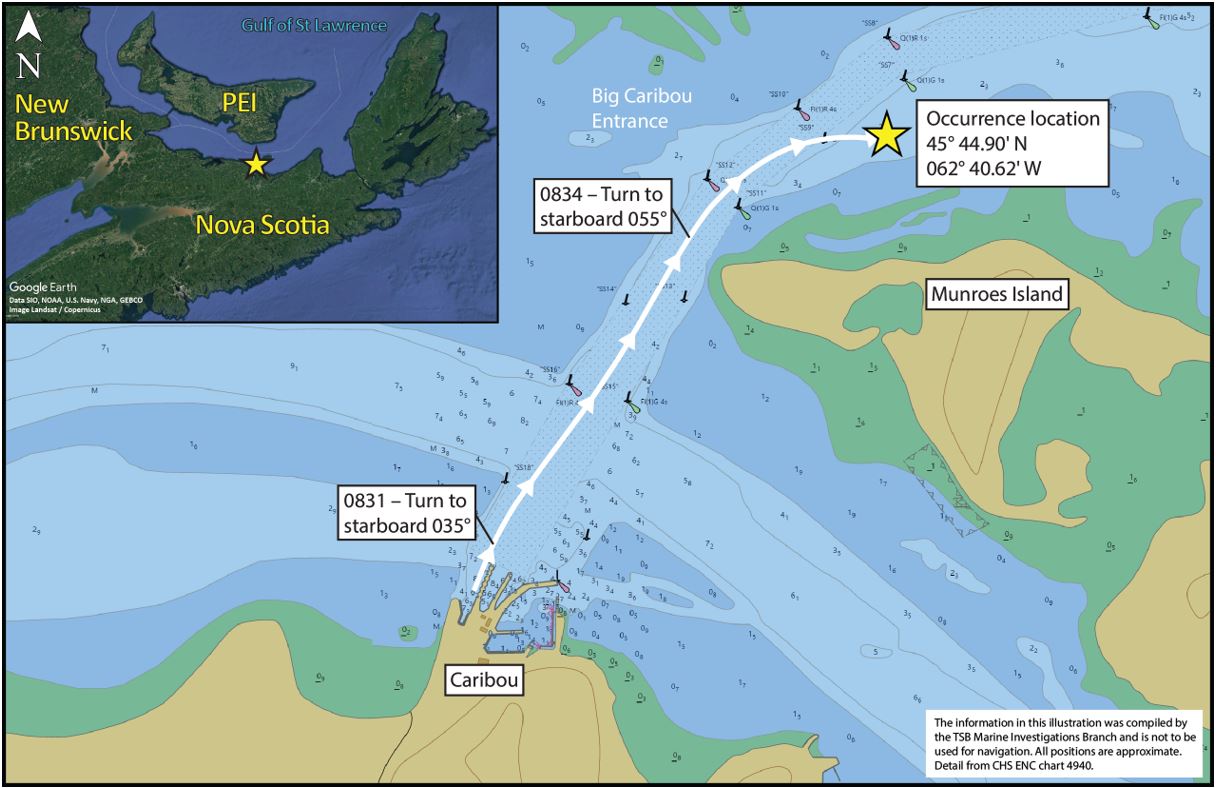 At 0829, with the tide ebbing and a light breeze, the vessel departed the Caribou ferry terminal and then made the first turn to starboard to proceed out of the channel on a course of 035 degrees, increasing to a speed of 11 knots.Footnote 3 The quartermaster was steering the ship from the main steering position facing Bow 2. The master was controlling the propellers and engines from the starboard (east) bridge wing console.