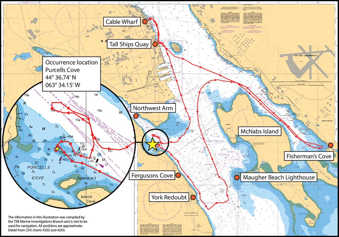 At 1245, when the vessel was approximately 160 m from shore, under the master’s command the course was altered 110 degrees to starboard. The vessel proceeded in the direction of the Northwest Arm, following the shore along York Redoubt and Fergusons Cove, maintaining an average distance of 100 m from shore.