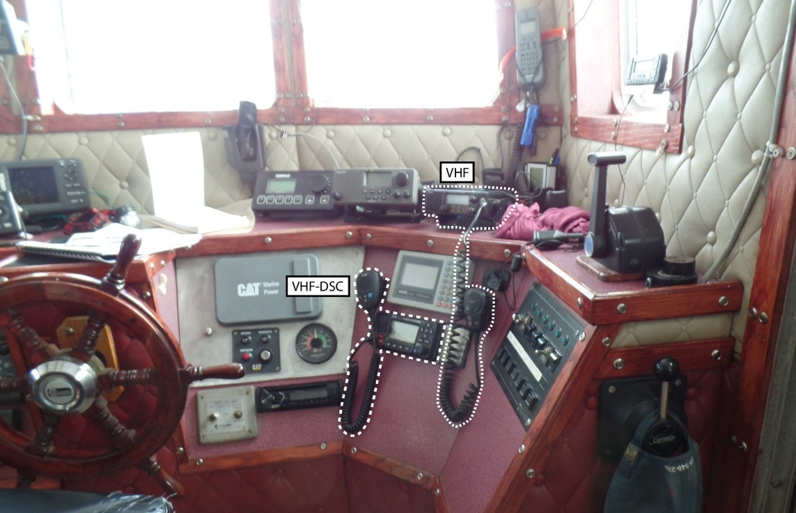 The wheelhouse had 2 doors, 1 each to port and starboard, that led to the forward upper deck. The aft portion of the upper deck was only accessible on the port side. The wheelhouse was also accessible via stairs from the galley, which was located on the main deck. The wheelhouse had a navigation console that was located starboard of the centreline and equipped with a conning station, a helm, propulsion control, a radar, an electronic chart, a GPS (global positioning system), an autopilot, and an automatic identification system (AIS). The Silver Condor was also equipped with 2 very high frequency (VHF) radiotelephones, 1 of which had digital selective calling (DSC) with integrated GPS (Figure 4). The microphones for the 2 VHF radiotelephones were in very close proximity to each other. An antenna for the vessel’s VHF-DSC radiotelephone was fitted to the top of the wheelhouse; the antenna’s maximum height was about 10 m above sea level.