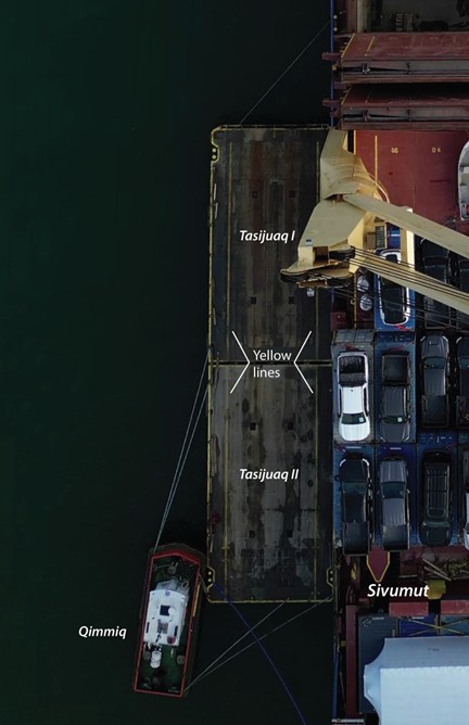 Every spring, in preparation for the Arctic sealift season, Tasijuaq I and Tasijuaq II are painted with 2 yellow lines that run the length of the deck from aft to forward. Each line is 1.22 m inboard from the port and starboard sides, and is used to indicate the limits of where containers should be placed (Figure 3).